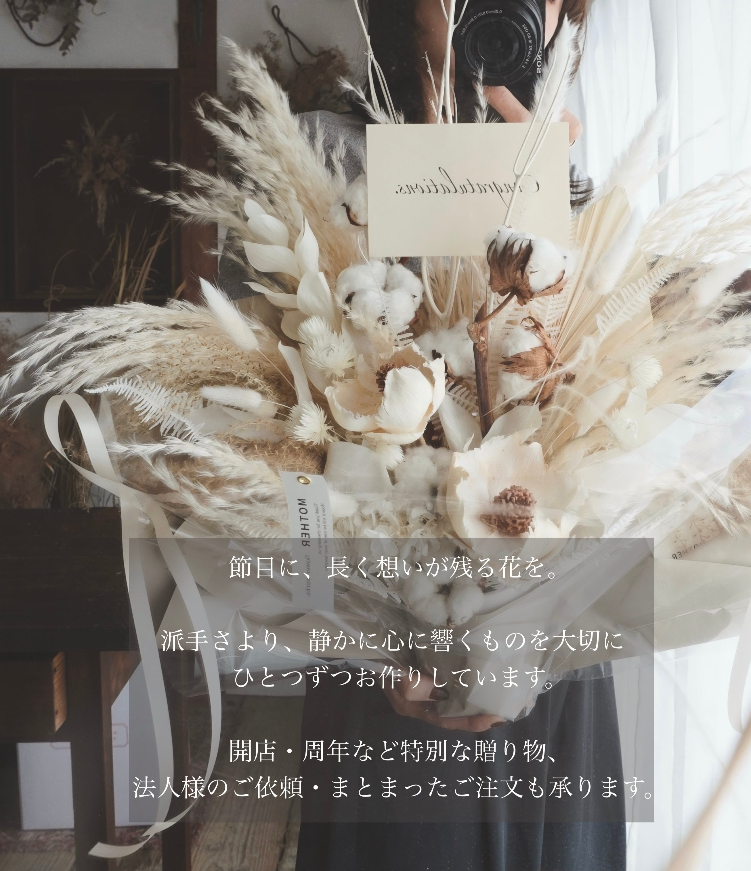 贈ったあとも、ずっと飾り続けられる。 時間が経っても、気持ちが色褪せない。 そんなお祝いの花を作りました。 箱を開けたらそのまま飾れるため、 水やり不要で、忙しい日常にもそっと寄り添います。 すべて一点もののため、 同じ表情のものは二つとありません。 開店祝いや周年祝い、新築祝いなど 大切な節目に。 飾り続けられる美しさは、 「おめでとう」や 「これからも応援しています」という想いを、 そっと長く伝えてくれます。 おおよそのサイズ(cm)45×44 ※花瓶等映り込み雑貨は含みません ※写真のメッセージカードは一例です ※ラッピングはイメージです ⚫︎写真のラッピングはグレージュです ⚫︎恐れ入りますが、領収書の発行は行っておりません。 注文完了メールや決済明細をご利用ください。 ◾︎ 立札/メッセージカード (オリジナルメッセージ※有料¥50 は備考欄へ) ◾︎ 選べる支払い方法 クレジットカード/コンビニ決済/PayPay/キャリア決済他 ◾︎ 選べるラッピングイメージ ◾︎ お贈り先へ直接、お届け可能です。その先はお送り先様情報・ご購入者様情報 それぞれご入力くださいませ ⚪︎発送日数 受注制作を除き5日以内の発送 ・ご注文日を0日目とします ・日・祝は日数に含みません ⚫︎日時指定⚫︎ 日時指定の際はご注文日より7日以降〜14日以内でのご指定をよろしくお願いいたします ※上記以外のご希望の方は事前にお問い合わせをお願いいたします ※※ヤマト運輸では、下記の時間帯からお選びいただけます。 * 午前中(8:00~12:00) * 14:00~16:00 * 16:00~18:00 * 18:00~20:00 * 19:00~21:00 * 20:00~21:00 ※「午前中」は時間を細かくご指定いただけません ⚪︎メッセージカードの内容を備考欄にお願い致します (例)・Congratulations!〇〇〇 ・祝 御開店 〇〇〇 など 新築祝い・開店祝い・周年祝い・就任祝い・誕生日プレゼント・母の日ギフト __________________ ご購入の際のお願い ※必ずご一読いただき、ご了承のうえでお手続きをお願いいたします。 * 鋭利なワイヤーや繊細な花材を使用しております。お取り扱いには十分ご注意ください。 * ご注文後すぐに発送準備に入りますため、お客様都合でのキャンセルはお受けできません。 * 商品によっては同梱が可能な場合がございます。複数ご購入を希望される際は、必ず購入手続き前にご連絡ください。購入後の変更は承れませんので、あらかじめご了承ください。 商品について * すべて繊細な素材を使用して製作しております。梱包には細心の注意を払っておりますが、配送中の振動により花びらなどが外れる場合がございます。 * 湿気の多い場所や直射日光の当たる場所でのご使用は、退色や劣化の原因となります。 * プリザーブドフラワーは湿度などの影響により、まれに色移りする場合がございます。ご使用の際は十分ご注意ください。 * 密閉状態での長期保管はお花の劣化につながります。お手元に届きましたら、なるべく早めに開封をお願いいたします。 返品・交換について * お客様都合による返品・交換はお受けできません。 * 万一破損など不備がございましたら、商品到着日より2日以内に「お写真を添付のうえ公式LINE」までご連絡ください。