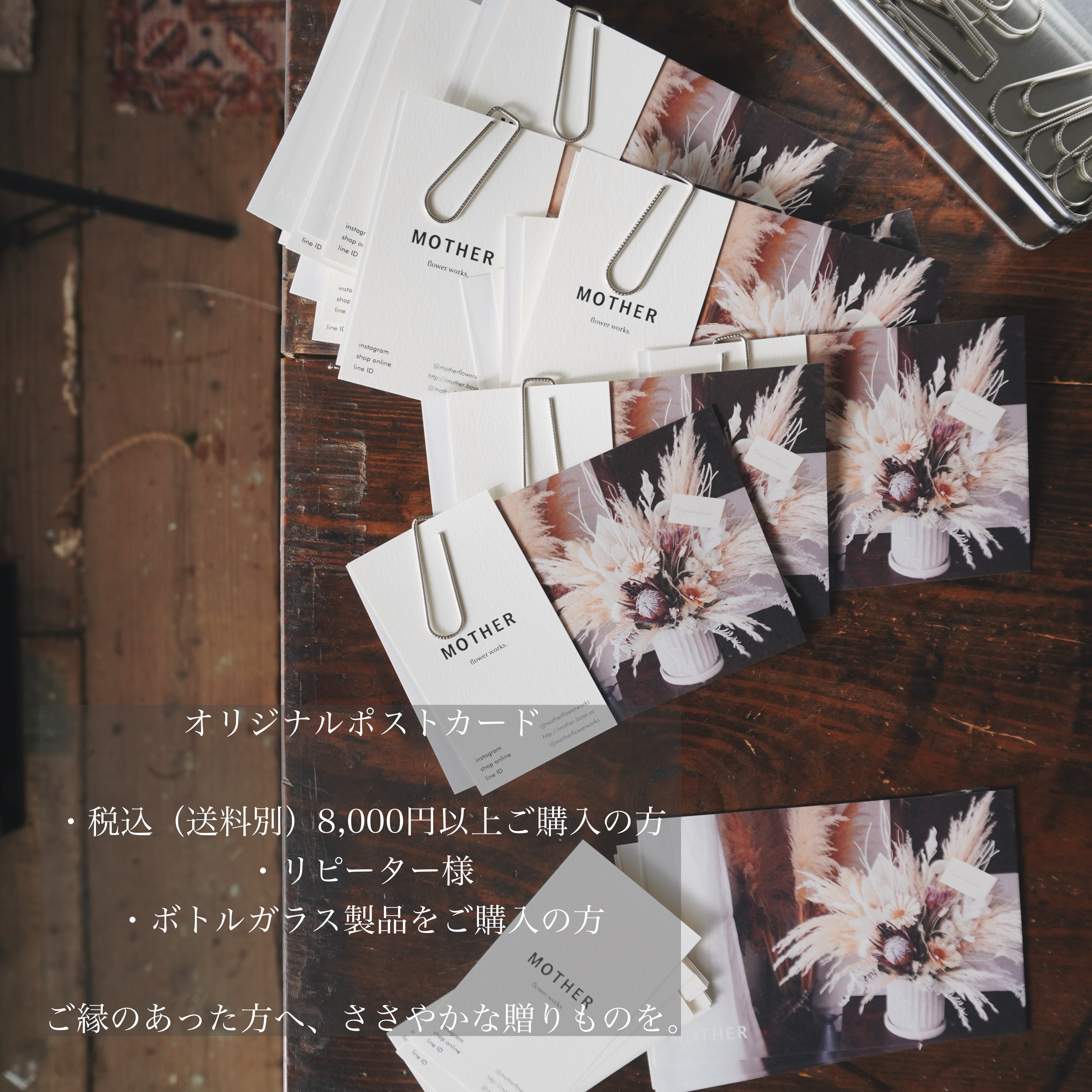 ※※※※※※※※ こちらのボトルフラワーは、在庫分をもって制作終了となります。アトリエ整理も兼ねて、今回のみお迎えしやすい価格にてご案内しています。気になっていた方は、この機会にぜひお迎えいただけたら嬉しいです。 ※※※※※※※※※ Bottle flower ※写真はイメージです 1. 美しさが長く続く、ガラスドームの中の花々 ガラスの中に、プリザーブドフラワーとドライフラワーを美しくアレンジしました。 お手入れの手間もなく、長期間そのままの美しい状態で楽しめます。忙しい日常を送る方にも、手軽にお花のある生活を。 2. どこにでも飾れる、ナチュラルな魅力 キッチン、デスク、ベッドサイドなど、お好きな場所に飾れるコンパクトなサイズ。 場所を選ばず、お部屋の雰囲気を明るく彩ります。 3. 可愛くおリボンをかけてお届けします おおよそのサイズ(cm)H12 W7.5 (花の向きなどにより多少前後します) ※花瓶等映り込み雑貨は含みません 画像はイメージです。 出来るだけ同じ花材・雰囲気で全体のデザインをした物をお届けいたします ※花材は変更する場合あり 全て一点もの・手作り・自然物のご理解ご了承くださいませ ◾︎ 立札/メッセージカード (オリジナルメッセージ※有料¥50 は備考欄へ) ◾︎ 選べる支払い方法 クレジットカード/コンビニ決済/PayPay/キャリア決済他 ◾︎ お贈り先へ直接、お届け可能です。その先はお送り先様情報・ご購入者様情報 それぞれご入力くださいませ ◾︎ 領収書の発行はございません。 注文完了メールや決済明細をご利用ください ⚪︎発送日数 受注制作を除き5日以内の発送 ・ご注文日を0日目とします ・日・祝は日数に含みません ⚫︎日時指定⚫︎ 日時指定の際はご注文日より7日以降〜14日以内でのご指定をよろしくお願いいたします ※上記以外のご希望の方は事前にお問い合わせをお願いいたします ⚪︎メッセージカードの内容を備考欄にお願い致します (例)・Congratulations!〇〇〇 ・祝 御開店 〇〇〇 など 新築祝い・開店祝い・周年祝い・就任祝い・誕生日プレゼント・母の日ギフト __________________ 【ご購入の際のお願いごと】 ※必ずご一読、ご了承の上お手続きをよろしくお願いいたします 硬くて鋭いワイヤーや枝を含む花材を使用しておりますので、取り扱いには十分ご注意ください。グルーガンやワイヤーの使用により、見る角度によってはリースの台やグルーが見える場合があります。あらかじめご了承ください。 ご注文頂きました時点で発送作業に入っております。お客様都合によるキャンセルはご遠慮ください 商品により同梱できる場合もございます。複数お求めの際はご購入前にご連絡下さいませ。購入お手続き後は変更できませんのでご了承くださいませ 全て大変繊細な素材でお作りしております 梱包には細心の注意を払っておりますが 配送中の振動により花びらなどが取れてしまう場合もございます 出来る限り防虫に努めておりますが自然素材の為、虫がつく場合がございます。植物ですのでご理解下さいませ 湿気の多い場所・また直射日光の当たる場所でのご使用は退色・劣化を早めてしまう可能性がございます プリザーブドフラワーは湿度などにより色移りを起こす事がございますのでご注意下さい 密閉したままの保管は、お花の状態に影響致しますので届きましたら早めの開封をお願い致します お客様都合による返品・交換は不可となります。破損等ございましたら商品到着日より2日以内にお写真添付の上、公式LINEへご連絡ください