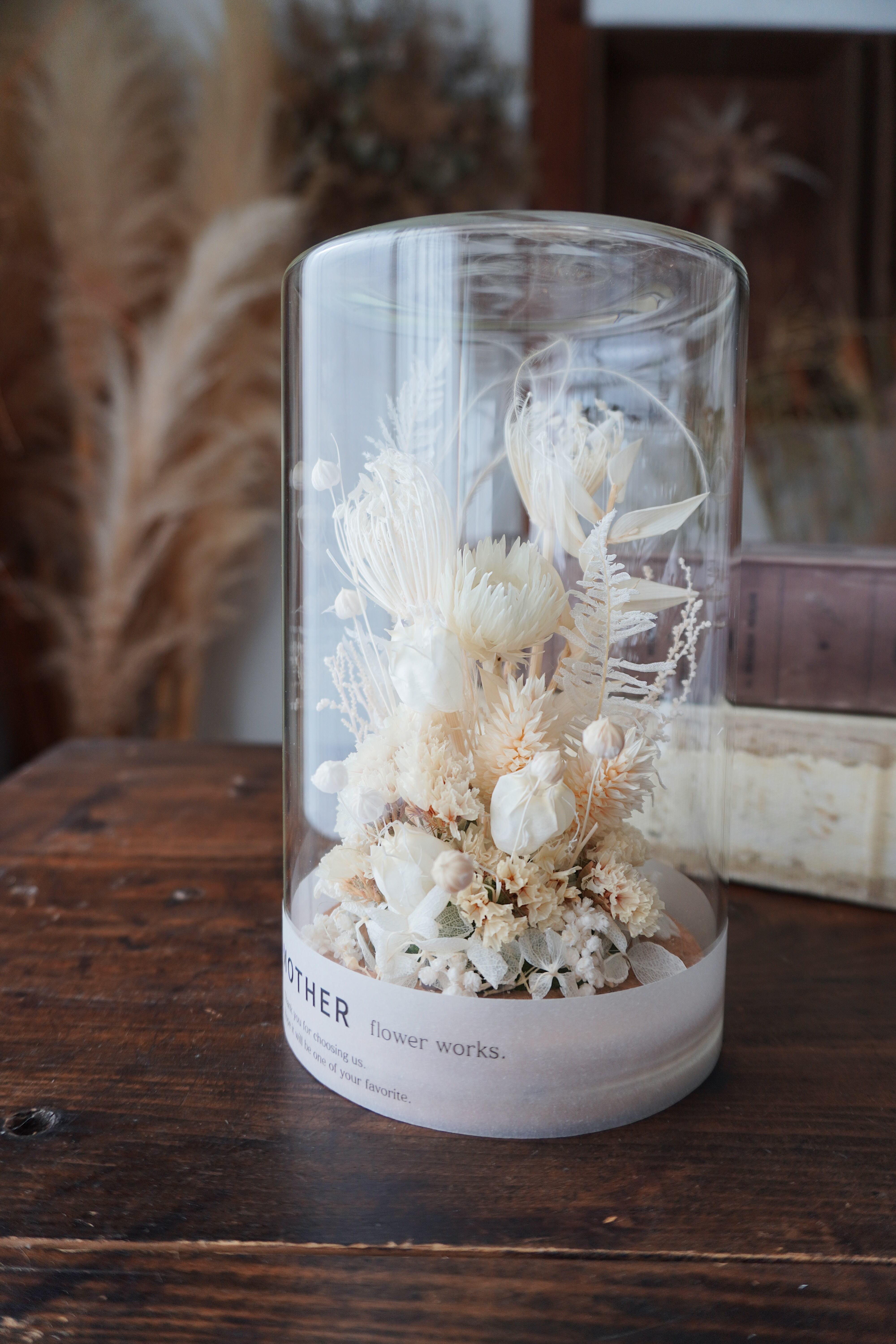 ガラスの中に、プリザーブドフラワーとドライフラワーを美しくアレンジしました。