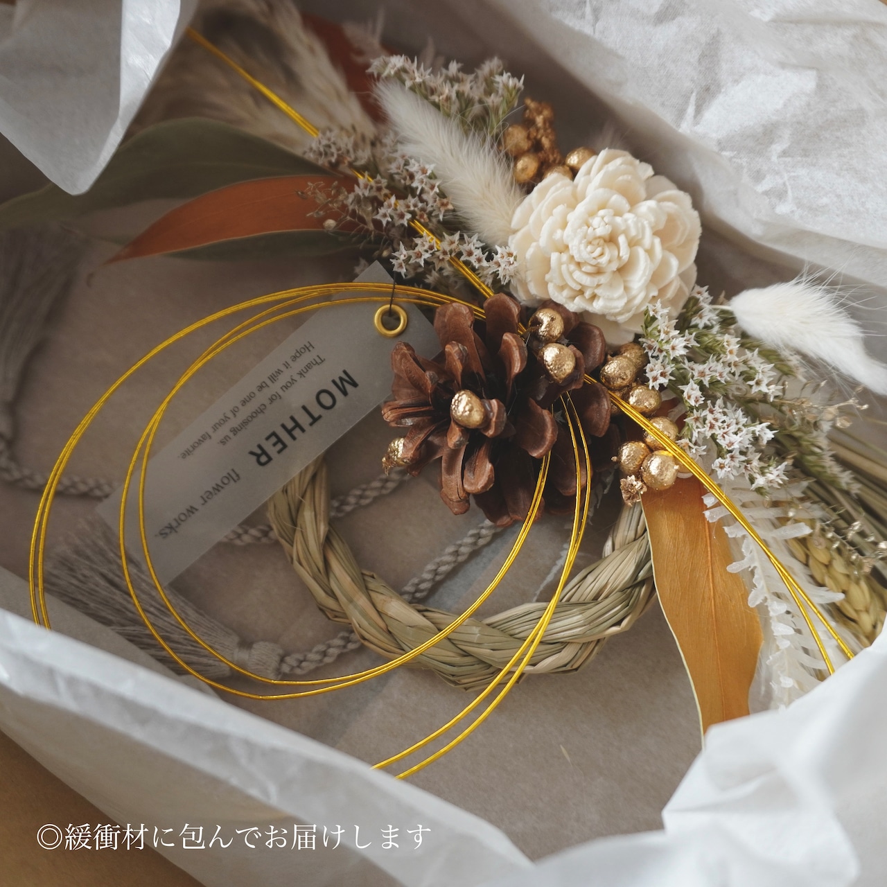 やわらかな白とナチュラルベージュを基調に、コットンやプリザーブド素材を贅沢に束ねた一点もののしめ縄飾りです。