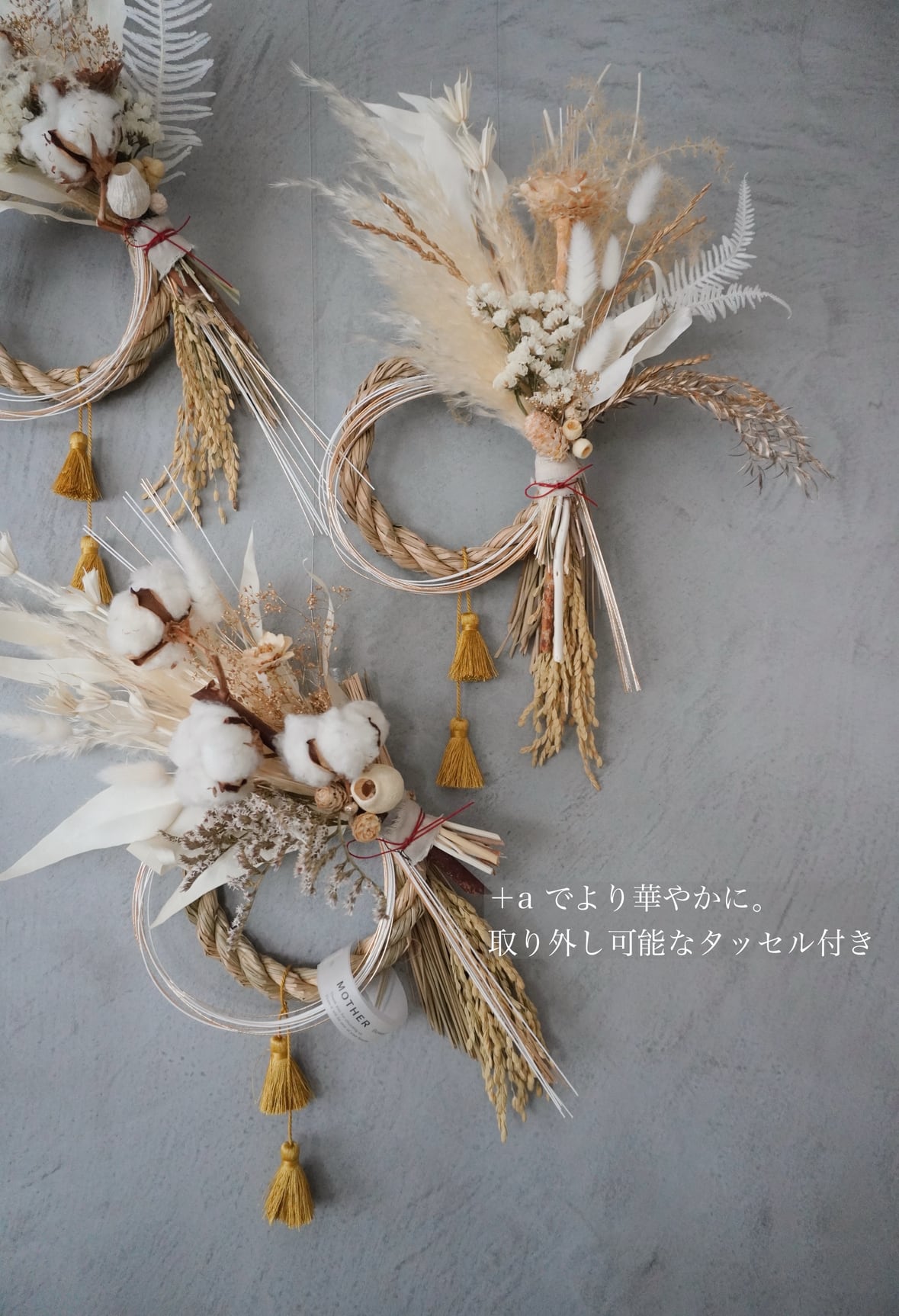 やわらかな白とナチュラルベージュを基調に、コットンやプリザーブド素材を贅沢に束ねた一点もののしめ縄飾りです。