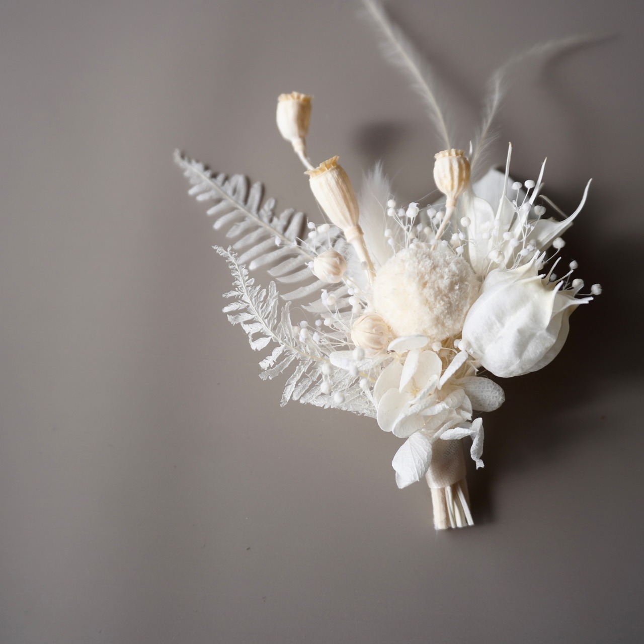 プリザーブドフラワーの白を基調に、繊細な素材を重ねたセレモニーコサージュです。