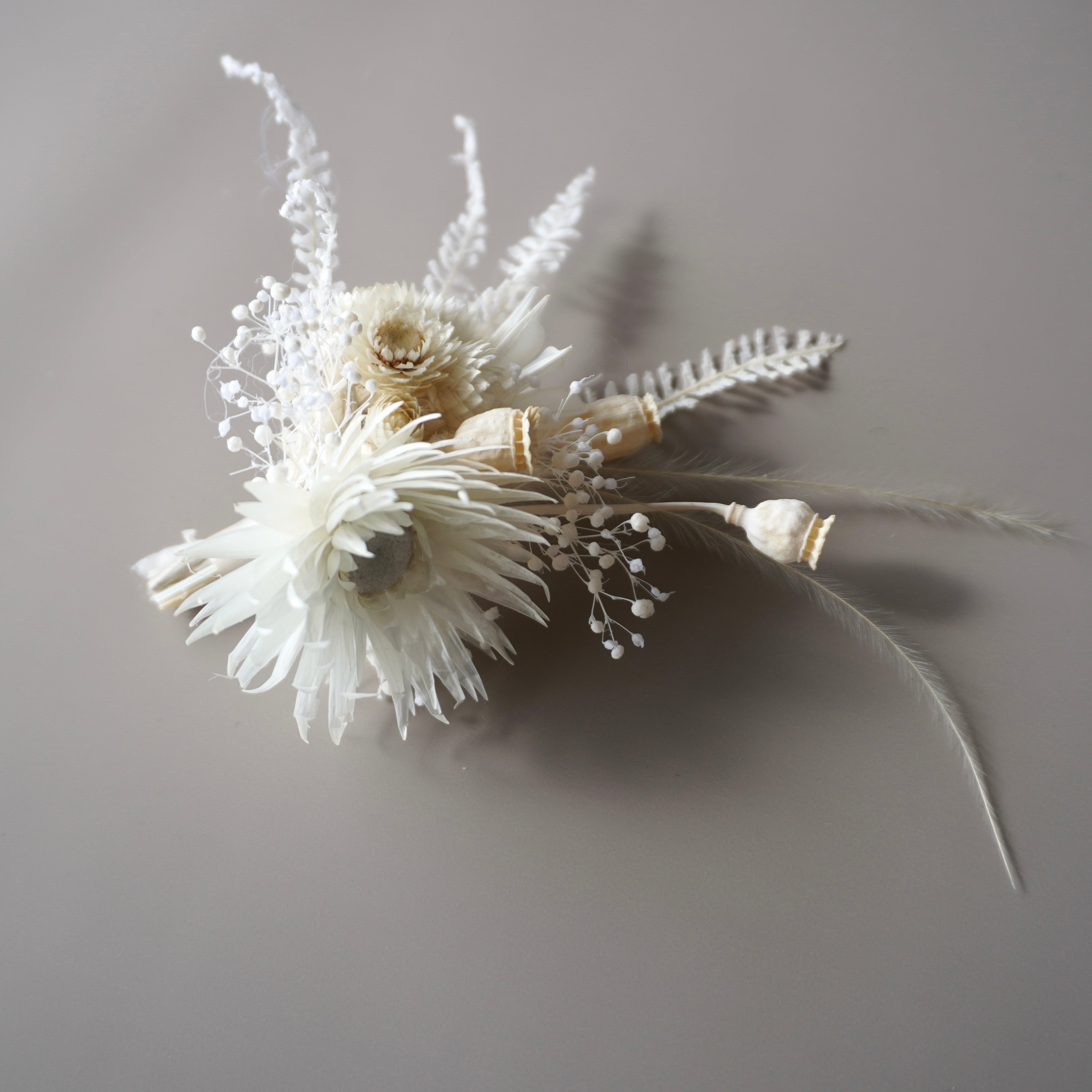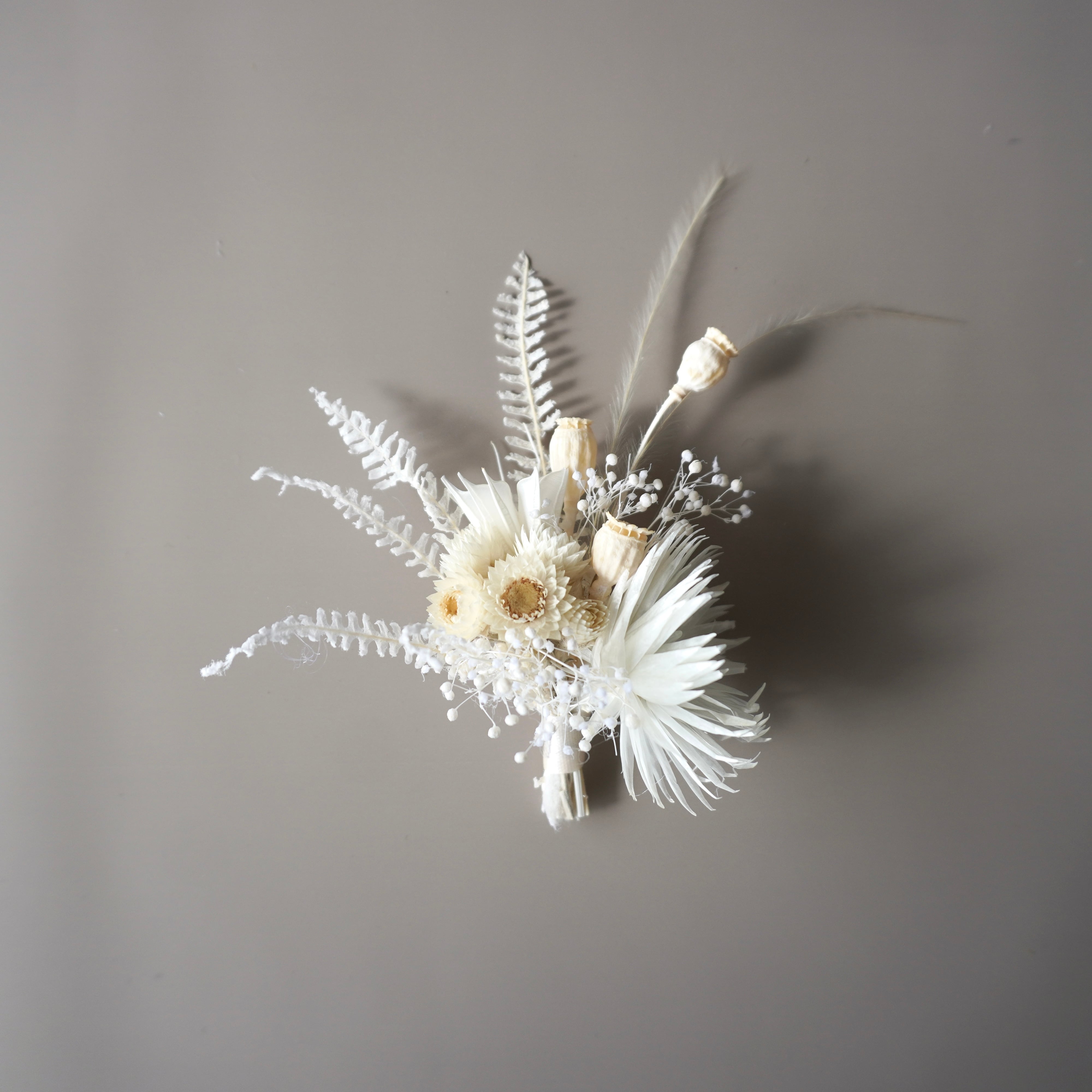プリザーブドフラワーの白を基調に、繊細な素材を重ねたセレモニーコサージュです。